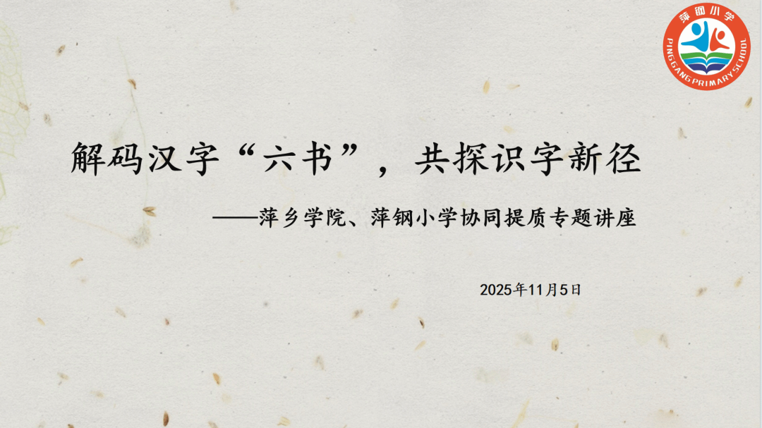 汉字是中华文化的根脉,识字教学是语文学习的基石。为深化小学语文识字教学改革,提升教师对汉字学理论的实践运用能力,近日,萍钢小学特邀协同提质学校萍乡学院的高评研究与质量评估中心主任易志文教授,开展以“解码汉字‘六书’,共探识字新径”为主题的专题讲座。全体语文教师怀揣对教学的热忱齐聚一堂,在专家引领中溯源汉字智慧,为语文课堂注入鲜活力量。