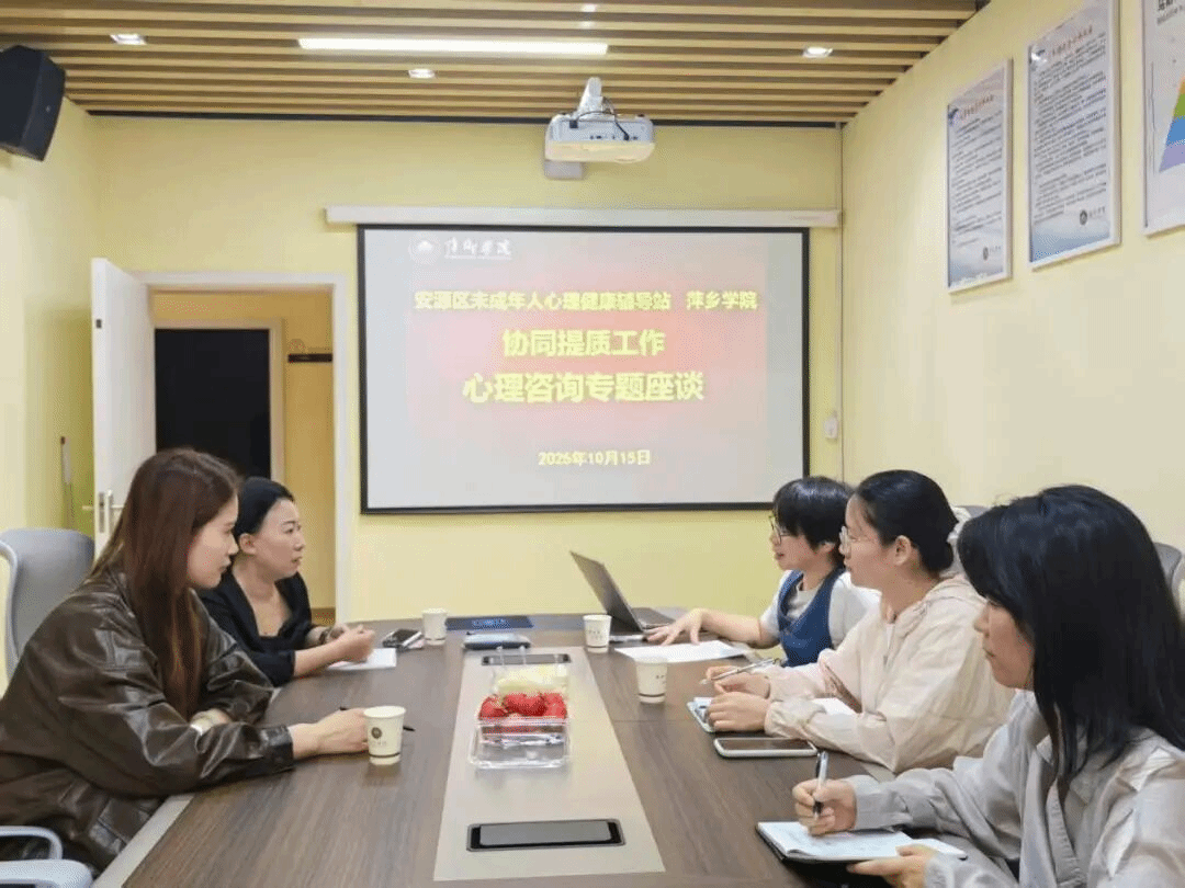 何晶、熊丹丹两位老师在实地参观心理中心后,与学校专职心理咨询教师围绕经验分享与案例研讨等内容进行了深入座谈。座谈会上,我校心理健康教育与咨询中心主任刘寅华系统介绍了学校当前心理健康教育工作的开展情况与成效。何晶老师则详细阐述了安源区未成年人辅导中心面向区内各中小学所推进的相关工作举措。双方重点就学生心理健康状况摸排工作的组织实施、心理活动与心理课堂的开展情况等议题展开了充分交流,并在师资培训与咨询师个人成长方面达成进一步合作意向。