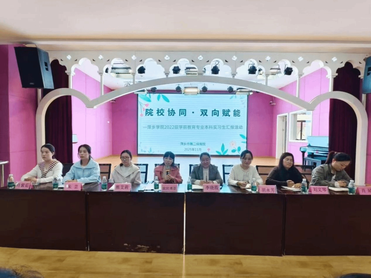 为深化院校协同育人,推动教育理论与实践融合。11月7日,萍乡学院2022级学前教育专业的同学们在萍乡市第二保育院多功能厅进行了一场精彩纷呈的实习汇报展示。这场以“院校协同,双向赋能”为主题的活动,既是对同学们一个多月实习生活的温情总结,也是萍乡市第二保育院作为优质实习基地育人成果的生动呈现。