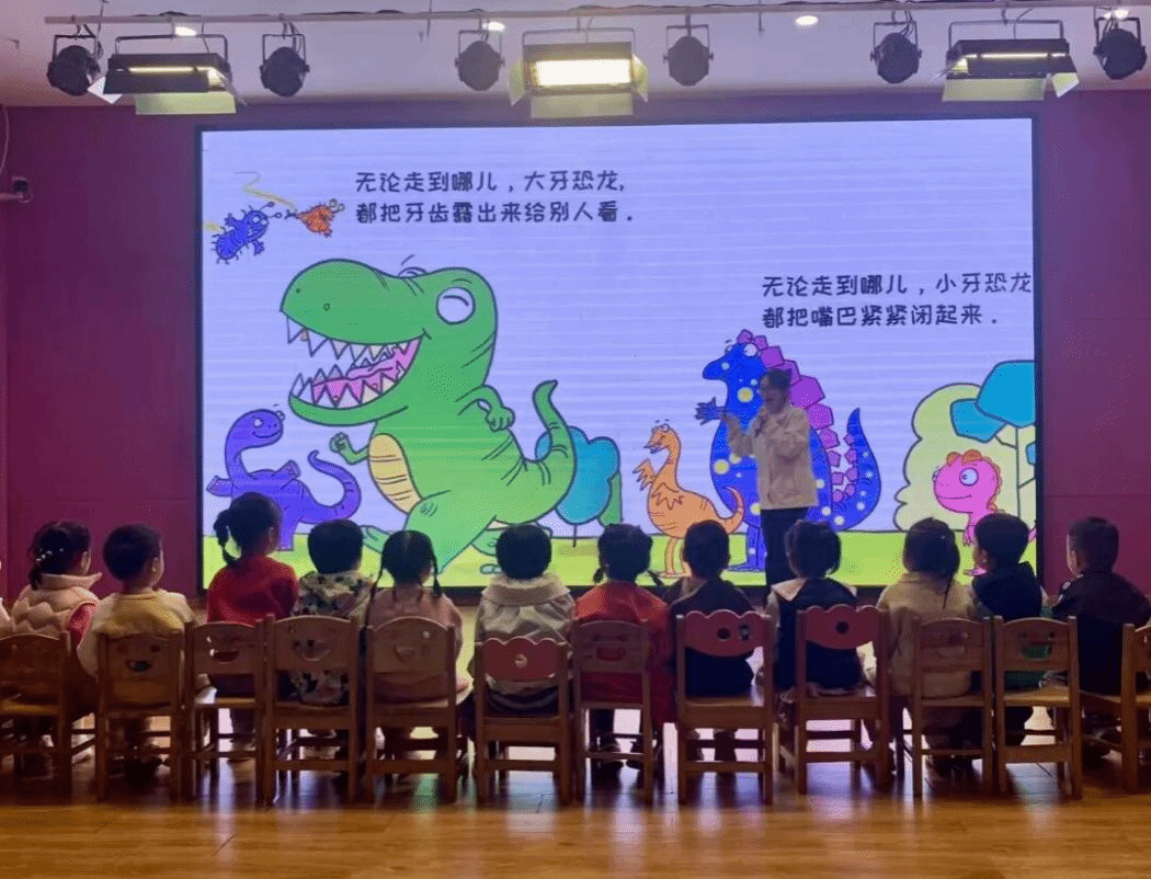 教学展示环节,两位实习生呈现了精心准备的教学活动。刘丽雯老师的《不爱刷牙的大恐龙》,用生动的故事情境激发孩子们的参与热情,让护牙知识在趣味互动中自然渗透。邱艺婷老师则通过手指律动与多媒体相结合的方式,带领孩子们走进《红猫和蓝猫》的故事世界,在多元体验中感受语言的魅力。